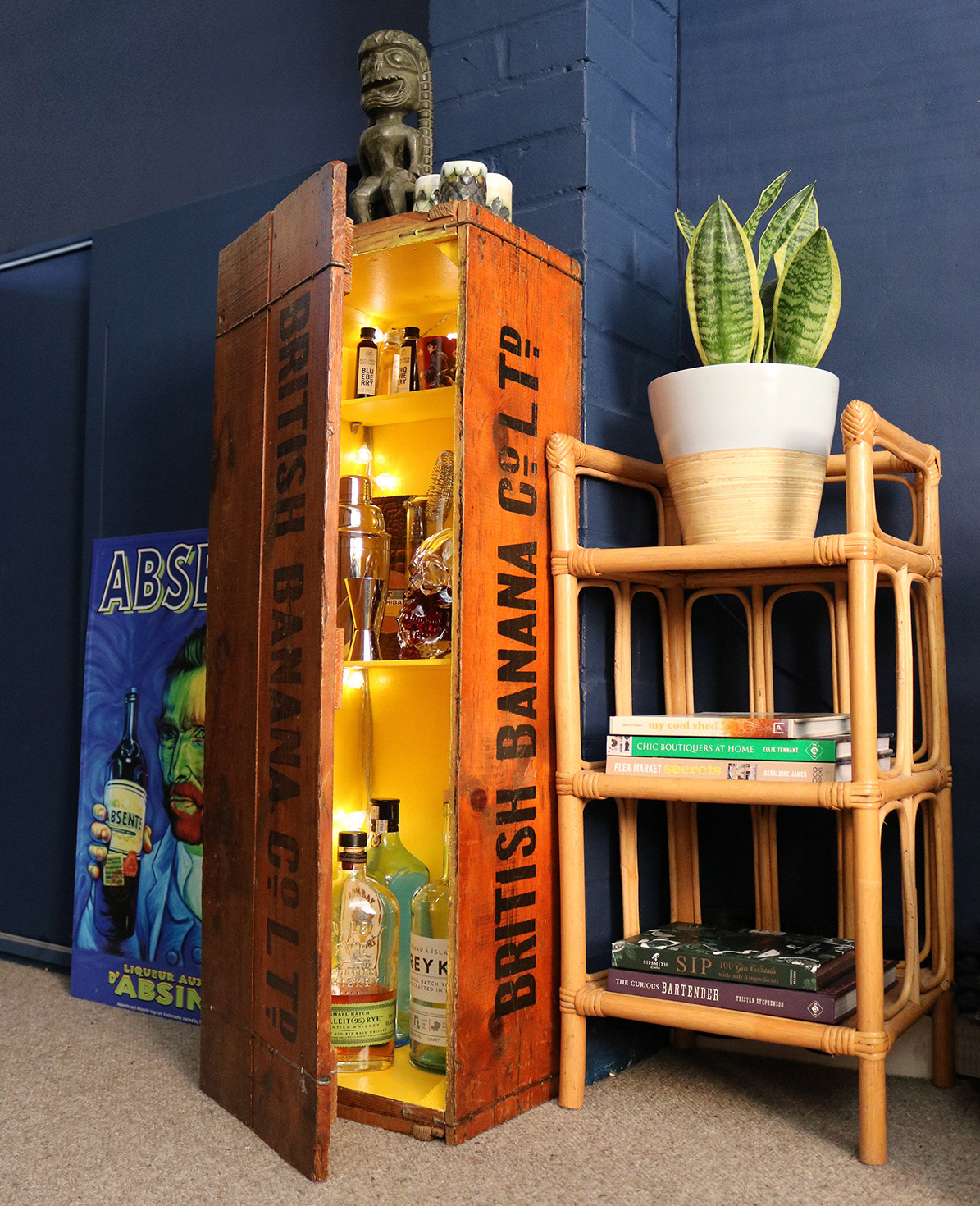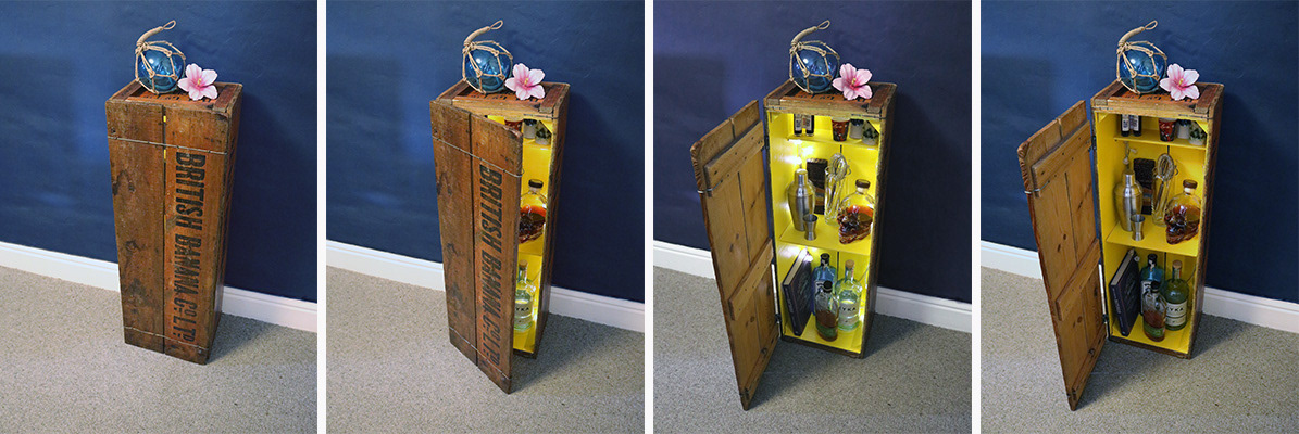 A one-off, handmade upcycled British Banana Co. Ltd. crate turned into a shelved drinks cabinet/bar. Internally lit using a mains powered string of decorative lights.