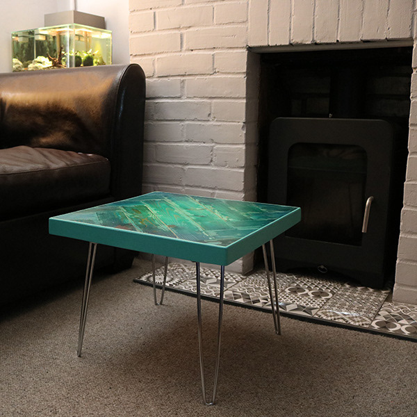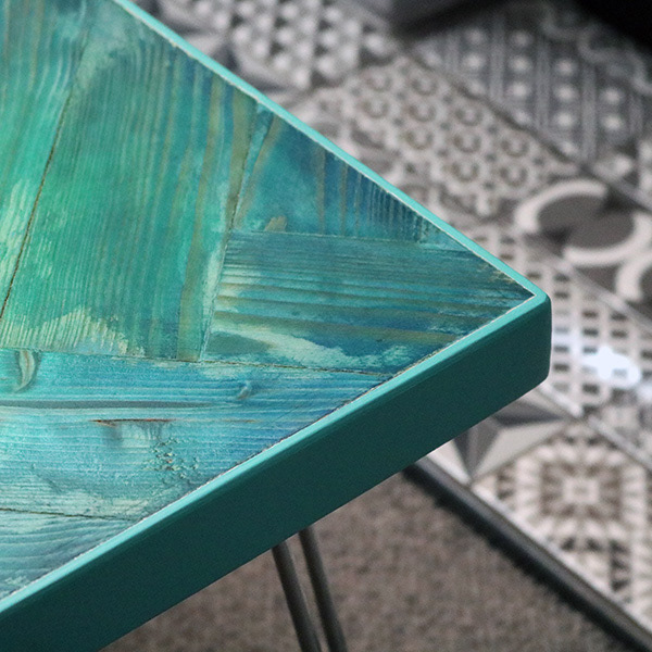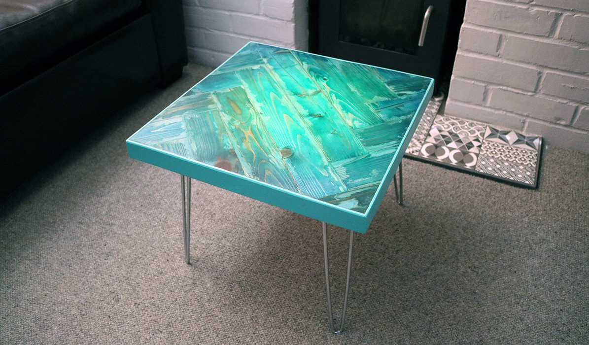 A one-off, handmade upcycled pallet-wood table with a gradient stain, an application of oil to preserve/finish and a painted plywood edging.